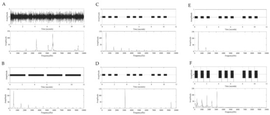 A screenshot of spectrum analysis for the six fire alarm sounds applied in the present study: bell (A), slow whoop (B), T-3 520 Hz (C), T-3 3100 Hz (D), simulated T-3 520 Hz (E), simulated T-3 3100 Hz (F). Each panel had an amplitude of two aspects for the time domain (upper) and frequency domain (bottom).