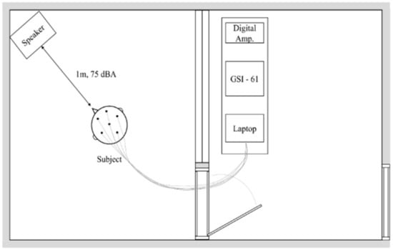 To minimize crossing errors, presentation order of the fire alarms was pseudo-randomized. Before listening to the fire alarm sounds, background EEG was measured for all subjects for 35 s in a relaxed condition without any external stimuli as the individual EEG reference. Then, six sounds of the fire alarm were presented by connecting the GSI-61 (Grason-Stalder, Eden prairie, MN, USA) to the laptop (6th Generation Thinkpad X1 Carbon, Lenovo Group Ltd., Beijing, China) (Figure 3) and EEG responses of each stimulus per subject were recorded. Notice that the subject was constructed to limit any physical movement while listening to the signals in the relaxing chair with a neck pillow.