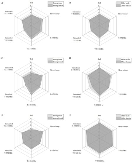 Results of psychoacoustic recognition induced by six different types of fire alarm sounds including age factor (left panels for young and right panels for old) and gender factors (light gray for male and dark gray for female): arousal (A,B), urgency (C,D), and immersion (E,F).