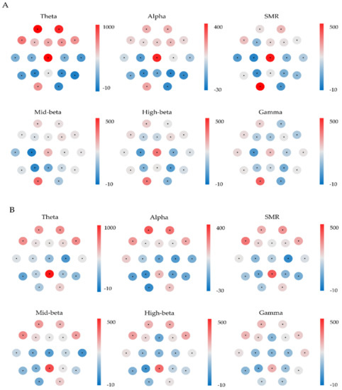 In the present study, the beta power (12–30 Hz) was subdivided as a frequency domain, such as SMR (sensorimotor rhythm, 12–16 Hz), mid-beta (16–21 Hz) and high-beta (21–30 Hz). As a result of confirming the distribution of the beta power according to the electrode placement, the sub-beta powers were distributed widely regardless of electrode placement.