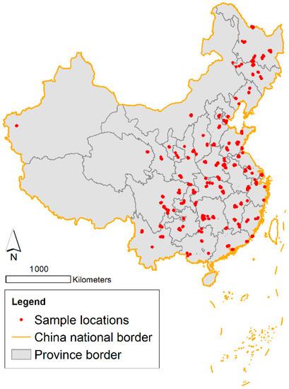 Individual-level socioeconomic characteristics were collected in CSS 2011 regarding the respondents’ age, marital status, ethnicity, insurance, lifestyle, education, household registration location (hukou in Chinese), occupation, income, and assets [48]. The survey also documented the types of communities, housing statuses, and urban-rural codes according to official documentation [48,58]. Neighborhood-level features include distance to a major road, population density, and GDP production per km2 as control variables. The major road categories include national roads, provincial roads, and ordinary roads that are similar to the US highway [59]. Table 1 demonstrates all data sources involved in this study. Sample locations are mapped in Figure 1.