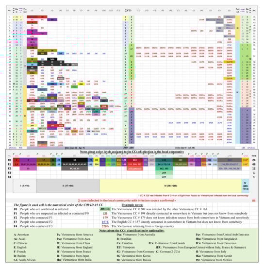 The classifications of COVID-19 patients and direct contacts are defined from F0 to Fi (i = 1, 2, 3, or more). To specify, F0 people are confirmed as infected, F1 people are suspected as infected or contacted F0, and F2 people contacted F1 and similarly the next generations F3, F4, etc. [31,32]. The map of 413 CCs (Figure 1) illustrates that with timely and drastic government policy responses, the rate of infection after F1 strongly declined. The whole country has 24 F0 CCs (5.81%), which resulted in 48 F1 CCs (11.62%). This led to 12 F2 CCs (2.91%) out of a total of 413 CCs. In each of the F3 and F4 generations only one CC appeared, which originated from CC #133—one of the super infectious cases and the fastest spreading case in period III (20 March–21 April)—the time with the highest number of cases of infection in the country [10].
