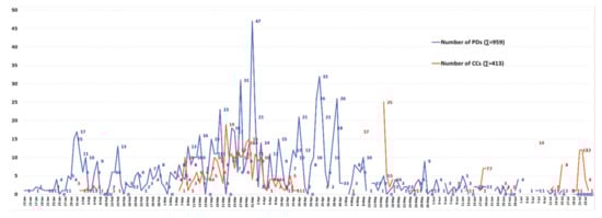 One of the most distinctive features of the COVID-19 policy responses in Vietnam was the mobilization of the whole political system, accepting economic losses in exchange for the safety of people’s health and lives, minimizing deaths from the pandemic [76]. As of 24 July, all 18 ministries had issued 406/959 documents (42.34%) and all 63 provincial units throughout the country had announced and implemented their own PDs as well (413/959 documents, accounting for 43.07%). By 24 July 2020, Vietnam saw CCs in 36 out of 63 provincial units. In Hanoi and HCMC, where the two largest international airports, Noi Bai and Tan Son Nhat, are located, these provincial units had peak numbers of CCs (121 and 62, respectively) as well as the most significant quantities of legal documents (45 and 39, respectively) (see Figure 3 and Figure S3).