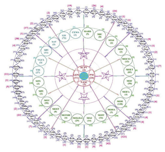 Figure 3 and Figure S3 illustrate the number of Vietnamese COVID-19 PDs of each authority, as well as the qualitative relationships between PDs classified by authority levels and the number of CCs of each province, from the earliest days of the outbreak to 24 July. The information of central levels (CLs) is represented by the inner red circle, central focal agencies (CFLs) in purple, ministerial agencies in green, and provincial people’s committees (PPCs) in blue. Specifically, the central levels (CLs) include four units: the National Assembly Standing Committee (NASC), Government of the Socialist Republic of Vietnam (GOV), Prime Minister (PM), and Secretariat of the Communist Party of Vietnam (SCPV), and the central focal agencies (CFLs) cover four units: the Central Propaganda and Training Commission (CPTC), National Steering Committee for COVID-19 Prevention and Control (NSCPC), the Supreme People’s Court (SPC), and the Supreme People’s Procuracy (SPP). The ministerial agencies (MAs) include 18 ministries: (1) Ministry of Agriculture and Rural Development (MARD), (2) Ministry of Information and Communications (MIC), (3) Ministry of National Defense (MND), (4) Ministry of Construction (MOC), (5) Ministry of Culture, Sports and Tourism (MOCST), (6) Ministry of Education and Training (MOET), (7) Ministry of Finance (MOF), (8) Ministry of Foreign Affairs (MOFA), (9) Ministry of Health (MOH), (10) Ministry of Home Affairs (MOHA), (11) Ministry of Industry and Trade (MOIT), (12) Ministry of Justice (MOJ), (13) Ministry of Labor, Invalids and Social Affairs (MOLISA), (14) Ministry of Natural Resources and Environment (MONRE), (15) Ministry of Science and Technology (MOST), (16) Ministry of Transport (MOT), (17) Ministry of Planning and Investment (MPI), and (18) Ministry of Public Security (MPS). The ministerial-level agencies (MLAs) cover six units: (1) Committee for Ethnic Minority Affairs (CEMA), (2) the Government Office (GO), (3) the State Audit of Vietnam (SAV), (4) the State Bank of Vietnam (SBV), (5) Vietnam General Confederation of Labor (VGCL), and (6) Vietnam Social Security (VSS). The PPCs include all 63 provinces. Vietnam covers 63 provincial units with 61 provinces and two special urban units under central authority, including HCMC and Hanoi capital—equivalent to the provincial level [74,75].