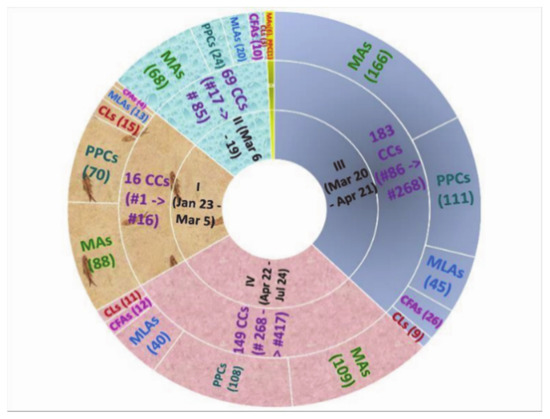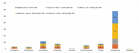 The numbers of PDs were also identified by the five types of agencies (CLs, CFLs, MAs, MLAs, and PPCs) and by period. The multi-level policy approach came from 33 different agencies (from the national to provincial levels), classified in five groups (including 4 CL units, 4 CFL units, 18 MA units, 6 MLA units, and 63 PPC units), in all periods from the beginning days of the outbreak (see Figure 4 and Figure S4).