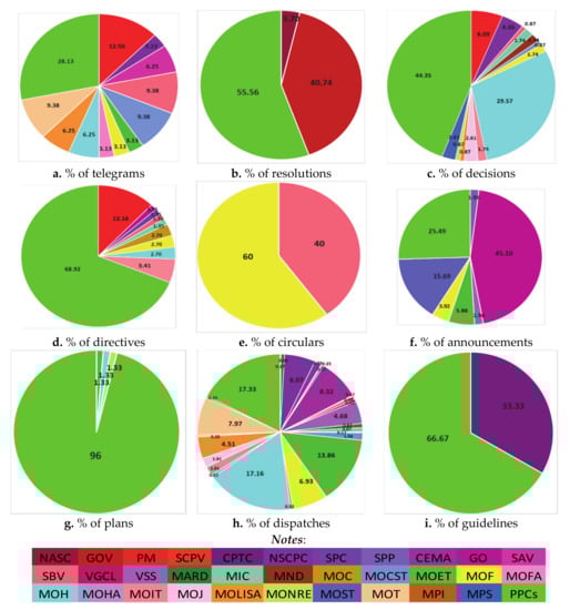 Among the 33 agencies, PPCs (from the 63 provincial units) not only utilized the most diverse range of policy document types (8/9), but in each type (except circulars and announcements) they also accounted for the largest proportion of the communications generated in comparison with the other agencies, from 28.13% of telegrams to 96% of plans, as illustrated in Figure 7. The next most diverse set of PDs were released by the MOF, using 6/9 types. The SBV and the MOH each used 5/9 types. Most other authorities issued 2–4 different types, such as the MOET (4/9), the PM, the GO, the NSCPC, the MOCST, and the MOLISA (each using 3/9), and the MOC (2/9) (see Figure 7 and Figure S7).