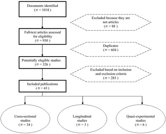 This systematic review yielded a total of 1018 search results, of which 998 were within the time period delimited by the inclusion/exclusion criteria. The extraction process for the studies included in this systematic review yielded a total of 43 articles. The studies were classified according to the methodological nature of the research: cross-sectional (n = 34), longitudinal (n = 3) and quasi-experimental (n = 6). A summary of the PRISMA flowchart of each stage of the search can be seen in Figure 1.
