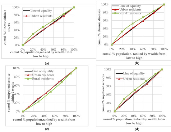The concentration curves of rural residents’ prevalence of diseases in the two weeks before the survey (CI = −0.1179) and prevalence of chronic diseases in the last year (CI = −0.1682) were above the equity line. This suggests that, for rural residents, these two indicators were concentrated in the low-income group. The concentration curves of prevalence of diseases in the two weeks prior to the survey (CI = 0.0129) and prevalence of chronic diseases in the past one year (CI = 0.0064) of urban residents were slightly below the equity line. This indicates that these two indicators for different income levels were slightly concentrated in the relatively high-income group. The absolute CI value of the prevalence of diseases in the two weeks before the survey and the prevalence of chronic diseases in the last one year among rural residents was greater than that of urban residents. This indicates that the equity of rural residents’ demand for health services was poorer than that of urban residents (Figure 1a,b).