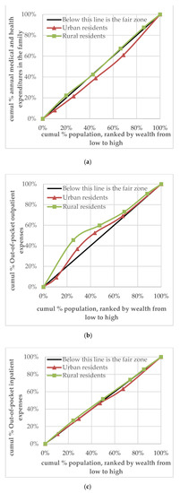 (a) Concentration curve of urban and rural households’ health expenditure; (b) concentration curve of urban and rural residents’ out-of-pocket payment for outpatient services; (c) concentration curve of urban and rural residents’ out-of-pocket payment for inpatient services.