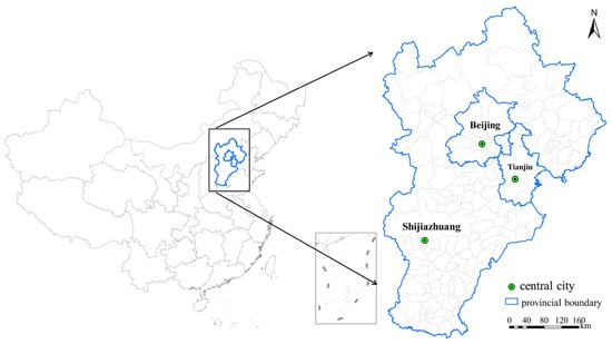 The study area is composed of 204 county-level administrative units (16 counties in Beijing, 16 counties in Tianjin, and 172 counties in Hebei Province) throughout the Beijing-Tianjin-Hebei region, located in north China (36°05′–42°40′ N, 113°27′–119°50′ E) (Figure 1). The Beijing-Tianjin-Hebei region is China’s “capital economic circle” and one of the most densely populated urban areas in China. In 2019, the land area (1.24 × 105 km2) of the Beijing-Tianjin-Hebei region accounted for only 2.3% of the country, but concentrated 8.1% of the country’s population (1.13 × 108) and 9.7% of the county’s GDP (8.46 × 1012 Yuan). The urbanization rate is 86.60% in Beijing, 83.48% in Tianjin, and 57.60% in Hebei Province [].