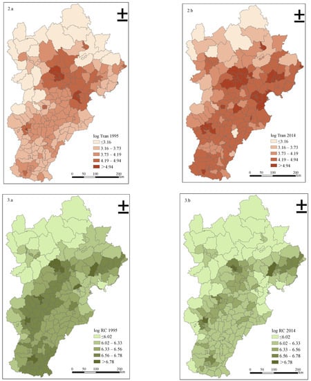 Regarding PM2.5 emission intensity based on residential and commercial, the overall change in the counties in the Beijing-Tianjin-Hebei region during the past two decades has not changed significantly (average value of 6.2076 in 1995 and 6.4677 in 2014) (Figure 2(3.a,3.b)), and the spatial change trend is not obvious. Compared with 1995, the county-level administrative units with high log RC are still concentrated in the central and southern areas of the study area 20 years later.