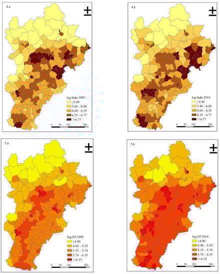 Figure 2(1.a,1.b) reveals the spatio-temporal evolution of urban expansion and PM2.5 emissions in Beijing-Tianjin-Hebei region from 1995 to 2014. The classification method used in Figure 2, Figure 4, Figure 5 and Figure 6 was Natural Breaks (Jenks), meaning classes are divided based on the natural groupings inherent in data. The features are divided into multiple classes whose boundaries are set where the relatively large changes in the data exist. From 1995 to 2014, after two decades of development, the urban expansion in the Beijing-Tianjin-Hebei region made significant progress. Overall, the average value of log LD in the study area increased from 0.9397 in 1995 to 1.1392 in 2014. From the perspective of spatial changes, there were large differences in the speed of urban expansion in different regions. County-level administrative units located in the northwest of the Beijing-Tianjin-Hebei region, such as Kangbao County (the value of log LD was 0.38 in 1995 and 0.42 in 2014) and Guyuan County (the value of log LD was 0.41 in 1995 and 0.45 in 2014), maintained a low level of urban expansion and underwent little change during the past two decades; whereas county-level administrations located in the central and southeastern regions, such as Tongzhou (the value of log LD was 1.29 in 1995 and 1.68 in 2014) District and Yongnian County (the value of log LD was 0.94 in 1995 and 1.30 in 2014), experienced significant urban expansion. In addition, the urban agglomeration phenomenon in 2014 was more obvious than in 1995, particularly in Beijing, Tianjin, and surrounding cities.