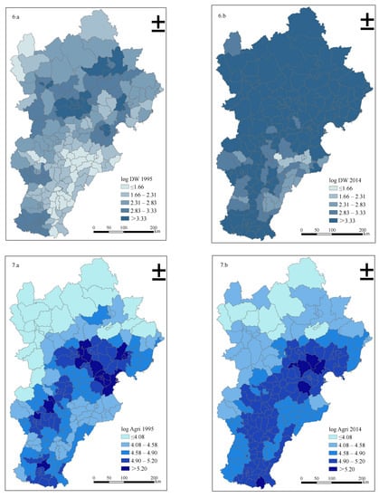 Overall, the PM2.5 emission intensity from agriculture in the Beijing-Tianjin-Hebei region did not change significantly (average value of log Agri was 4.7293 in 1995 and 4.8050 in 2014) (Figure 2(7.a,7.b)). Regarding the change trend of its spatial distribution, the local accumulation was obvious in 1994, mainly concentrated in the Beijing-Tianjin area and Shijiazhuang and Handan areas in the south of Hebei Province; whereas two decades later, the counties in the east and south parts of the Beijing-Tianjin-Hebei area all became high log Agri value areas.