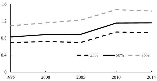 Model 1-based estimates of the temporal trends of urban expansion. The vertical axis legend represents the estimated log LD value of each county in the study area based on the model 1 simulation results. The three lines (75%, 50%, and 25%) represent the upper quantile, median, and lower quantile of estimation results on urban expansion after adjusting for covariate effects from 1994 to 2014.