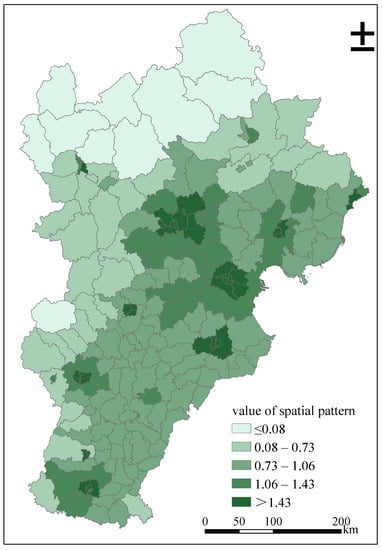 Estimated spatial patterns of urban expansion. Value of spatial pattern presents the estimates of spatial distributions of urban expansion, net of covariate effects.