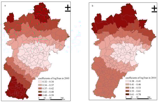 The results of log Tran based on the GWR model in Beijing-Tianjin-Hebei region in 2005 and 2010. (a) shows the degree of correlation between urban expansion and PM2.5 emission from the transport sector in the Beijing-Tianjin-Hebei region in 2005, while (b) shows that in 2010.
