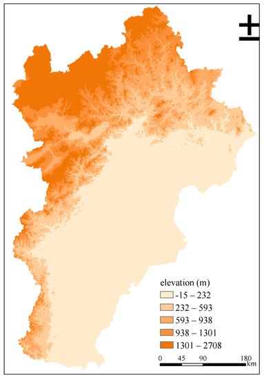 Regarding the simulation results of the GWR model, Figure 5 shows the spatial correlation between urban expansion and the PM2.5 emission from the transport sector in 2005 and 2010. Overall, the spatial correlation between urban expansion and the PM2.5 emission from transport sector in the Beijing-Tianjin-Hebei region increased, and we deduce that this is related to the popularity of family cars []. However, from 2005 to 2010, its spatial distribution did not change significantly, and both showed a gradual weakening trend from northwest to southeast, which is presumably related to the topographical factors of the study area (Figure 6) [].
