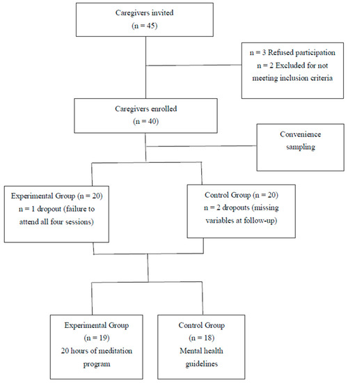 Relevant associations in the city and province of Granada city were contacted by the researchers in person or by telephone, to recruit informal caregivers for the study. Inclusion criteria for participation were care for at least two years of a dependent family member or close relative living in the same dwelling; no receipt of any economic remuneration, and a caregiver burden > 55 points on the Zarit Burden Scale [27]. Each item in this scale was scored on a 5-point Likert scale (0 = never to 4 = nearly always), yielding a total score ranging from 0 to 88. No consensus was established on the cutoff score for a high burden; however, after a review of the literature, a value of 55 points was selected. Exclusion criteria were history of cardiovascular disease; and previous experience in mind–body practices. Written informed consent was obtained from all participants in the study, which was approved by the local research ethics committee (CEI-GR C-9) and followed the principles of the Declaration of Helsinki. Convenience sampling was used to assign caregivers to the control or experimental groups. Figure 1 depicts the flow of participants through the study. A single researcher (L.D.-R.) contacted participants by telephone to collect data on their medical history and demographic characteristics, including age, gender, ethnicity, marital status, educational level, occupation, alcohol and smoking habits, menopause status, time performing caring activity, relationship with care-receiver, weight, and height.