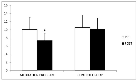 IBM-SPSS 26.0 was used for the statistical analysis. Results were expressed as means with standard deviation for continuous variables and percentages with 95% confidence intervals for categorical variables. Between-group differences at baseline were analyzed using t-tests for continuous variables and chi-square tests for categorical variables. After verifying the normality of the data distribution with the Kolmogorov–Smirnov test, an analysis of covariance (ANCOVA) was performed with time (pre, post intervention) as a within-subjects variable, intervention (meditation, control group) as between-subjects variable, and baseline levels of variables as covariates. The Bonferroni correction was used for post-hoc pairwise comparisons and <0.05 was considered statistically significant. The hypothesis of interest was intervention × time interaction. When an interaction was found, the inter-group effect size was calculated according to eta squared (η2), i.e., the proportion of variance in the dependent variable that is attributable to the factor in question. A η2 of 0.01 signifies a small effect, η2 of 0.06 a medium effect, and η2 of 0.14 a large effect [32].