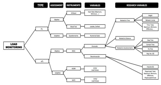 For this research, the age of the players (U14, U16 and U18) and sex (male and female) were defined as independent variables. For the assessment of the lower body strength of the athletes, the following variables were analyzed divided into three groups according to the type of requirements: (i) objective external load kinematic variables related to time or distance, (ii) objective external load neuromuscular variables and (iii) objective external load kinematic variables related to accelerometry [32]. Part of the selected variables has been defined and used in different investigations that share some of the objectives of this investigation [29,33,34]. See Figure 1.