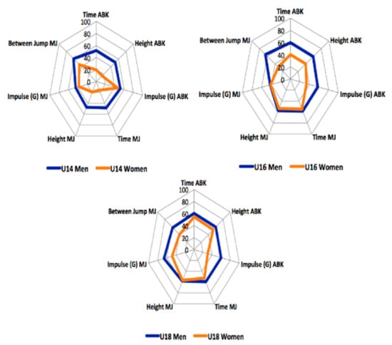 Figure 2 shows the normalized results obtained through the Z-Score grouped according to age and sex in the Abalakov test and the multi-jump test. It was observed that, both in the men and women, as the age of the players increased, the circumference of the profile was greater. This means that as the Z-Score visually shows the represented value that the standard deviation is above the mean. In this case, the larger the graph, the better results obtained by the athletes. Regarding the differences between sexes, men players obtained better results at all ages than women players in the variables analyzed.