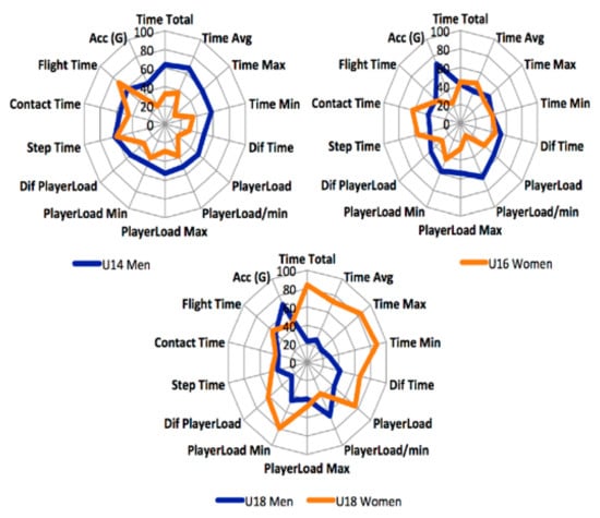 The relativized neuromuscular load per minute that players endure varies depending on the age. Like the previous variables, due to puberty, older players present higher strength values, and therefore their performance in these tests is higher [48]. These differences are only reflected between sexes at a maximum load; that is, men generate more load than women due to their genetic differences. One of the most important factors in the difference between sexes is linked to body size, in which women have a lower center of mass (smaller body size and smaller limb size) than men, implying lower load strength in the midfoot [51] and greater hip adduction angles [10]. Therefore, the gravitational forces that they support are different. These gravitational forces can be affected not only by sex or the angles of the hips but also by maturational development as puberty causes an increase in weight in the athlete (regardless of sex), and therefore, it affects the load supported.