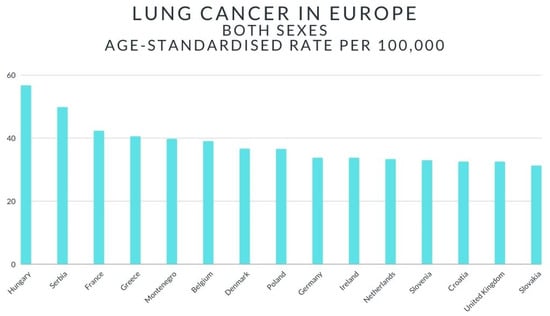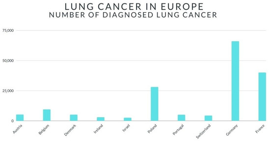 In Europe, lung cancer ranks second in terms of incidence. According to the data, as many as 23% of lung cancer cases worldwide occur in Europe [8]. In 2018, an estimated 1.8 million people developed lung cancer [8]. Figure 1 shows a graph showing the number of lung cancer cases (statistics for 2018) [8]. In Austria, lung cancer is the second most common cancer among men—2940 cases, and the third most common cancer among women—2202 cases [8]. In Belgium, 9400 people were diagnosed with lung cancer in 2018 [8]. Similarly to the Austrian population, lung cancer is the second most common cancer among Belgian men [8]—15% of all cases, and the third most common cancer among Belgian women—8% [8]. Moreover, it is the most common cause of cancer deaths among both women (15%) and men (30%). In France, lung cancer is the second most common cancer in both women and men [8]. In Germany, more than 66,000 cases of lung cancer were diagnosed in 2018-more than 27,000 women and over 39,600 men [8]. According to the data, in Poland, lung cancer has been diagnosed twice as often among men than among women [8]. In the United Kingdom, lung cancer is diagnosed in 1 in 17 women and 1 in 13 men [8]. Statistical analysis shows that in Sweden, lung cancer causes the highest mortality in both women and men [8]. The data presented in Figure 2 indicate that in 2018, Hungary had the highest rate of lung cancer [9].