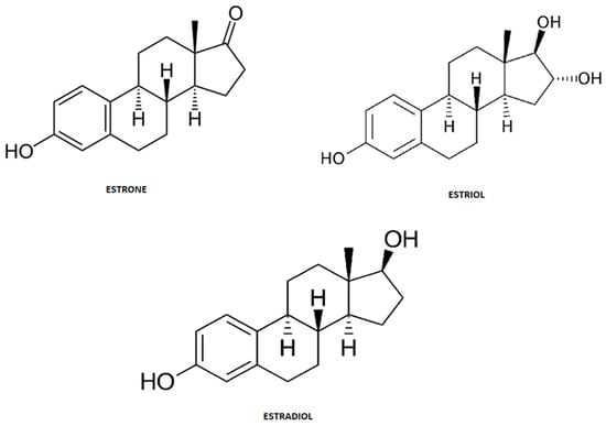 Steroid hormones are endogenous estrogens that include estrone (E1), estriol (E3) and 17β-estradiol (E2) (Figure 3). These structural and biogenic hormones are derived from cholesterol C17. LDL-cholesterol is the major reactant necessary for the synthesis of steroid hormones, which is called steroidogenesis [52,53,54].