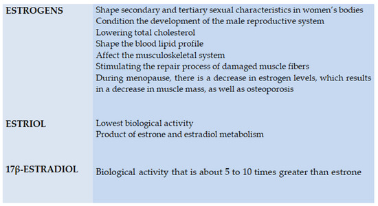 Estrogens also have a positive effect on the cardiovascular system, among other factors, by lowering total cholesterol [60], shaping the blood lipid profile and also affecting the musculoskeletal system by stimulating the repair process of damaged muscle fibers [56,71]. Notably, during menopause, there is a decrease in estrogen levels, which results in a decrease in muscle mass, as well as osteoporosis. The lowest biological activity is shown by estriol, which is considered to be the weakest of estrogens, being a product of estrone and estradiol metabolism. Estrone, in turn, exhibits a markedly higher biological activity [56,68,69,70,71]. Finally, the type of estrogen with the highest activity is a 17β-estradiol, with a potency of about 5 to 10 times greater than the former type. Both types of estrogen receptors—ERα and ERβ—have a relationship with the heat shock proteins (HSP) complex. In addition, estrogen receptors have the ability to form heterodimers and homodimers [47,68,69,70,71].
