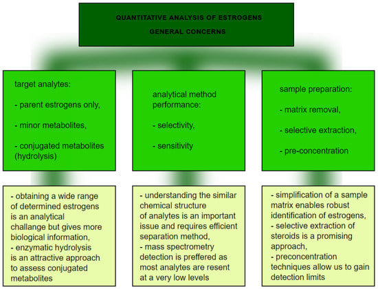 From the analytical point of view, this is not a straightforward task for several main reasons (Figure 5) Firstly, the analytical technique needs to have enough selectivity to differentiate between chemically similar compounds, so an efficient separation technique is required. To achieve that, chromatography is applied, with high performance liquid chromatography coupled to mass spectrometry as a method of choice [61,62]. Practically, it is not possible to separate lipophilic parent estrogens, their hydroxylated metabolites, and much more polar conjugates with glucuronic and sulfuric acids. In order to avoid the development validation of separate LC-MS methods for polar and nonpolar analytes, enzymatic hydrolysis is typically involved as a sample preparation step. β-glucuronidase/sulfatase from Helix pomatia has been proven to sufficiently hydrolyze estrogen metabolites [62]. The involvement of enzymatic cleavage enables us to gain detailed information about a wide range of estrogen metabolites. Secondly, due to the low levels of many of the above mentioned metabolites, the high sensitivity of the analysis is a critical issue. Sensitive quantification depends on the detection method and sample preparation. Mass spectrometry, despite being expensive, can detect estrogen compounds down to the pmol/L level [59]. On the other hand, extensive clean-up of a sample with simultaneous preconcentration of analytes is beneficial to improve sensitivity and avoid interfering compounds. Improvement at the sample preparation step in estrogen analysis is thus still required. The application of novel selective materials, including sorbents processed by using 3D-printing, can be a promising approach, especially in a high throughput format [63,64]. More selective extraction utilizing specific sorbent-analyte interactions can potentially further improve quantification of a wide range of estrogens. In particular, boronate affinity solid-phase microextraction, as was previously claimed to be useful for diol-containing compounds [65], seems to be an attractive approach.