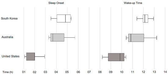 All participants had significantly delayed sleep patterns, but US participants slept earlier when compared to the other groups. Using the Kruskal–Wallis method for nonparametric test, participants from the US fell asleep significantly earlier and woke up earlier compared to the other two groups.