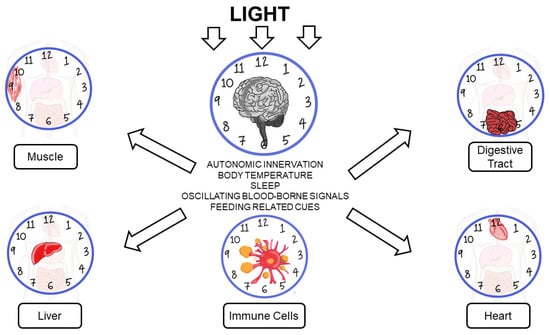 - Gamble, K.L.; Berry, R.; Frank, S.J.; Young, M.E. Circadian clock control of endocrine factors. Nat. Rev. Endocrinol. 2014, 10, 466–475. [Google Scholar] [CrossRef]