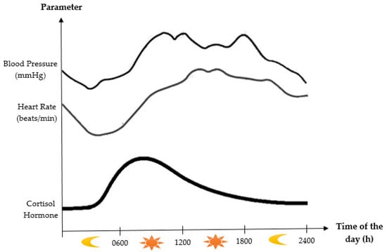 Diagram showing the circadian rhythms of blood pressure, heart rate, and cortisol hormone. Adapted from Selfridge et al. (2015) and Chan et al. (2010) [1,27].