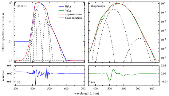 Chaopu et al. [24] approximated the spectral luminous efficiency for photopic vision, too, but in contrast to they applied an asymmetric double sigmoidal function. No successful reproduction of their fitting results could be achieved for this work. Instead, in analogy to the approximation of the BLH weighting function, a sum of four Gaussian curves according to Equation (2) was adapted to , see Figure 2b. The additive constant was set to zero, 0. All fitting parameters are listed in Table 1. There are large uncertainties for the fourth fitting curve, in particular for and , indicating that three Gaussian functions might have been sufficiently accurate, too. The coefficient of determination is 0.999. The residual is shown in Figure 2d, and only exhibits two pronounced deviations of −0.04 at 500 nm and of 0.02 at 526 nm.