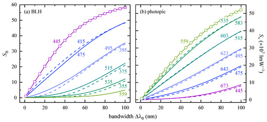 Radiation emission from color LEDs weighted with (a) the blue-light hazard action spectrum and (b) the spectral luminous efficiency for photopic vision, and according to Equation (8), respectively, depending on spectral bandwidth, . The peak wavelengths, , are given as numbers in nm, and vary in (a) with regard to 445 nm in steps of −30 nm or −20 nm (dashed lines) and 20 nm or 30 nm (solid lines). Open symbols represent discrete calculations based on Equations (3) or (4). Whenever possible, the line colors from (a) were also used in (b) with an equal ±20 nm or ±30 nm peak wavelength difference except for 559 nm for that the maximum values were found. Due to , the ordinate in panel (b) has the unit lmW−1 and is divided by a factor of 1000.