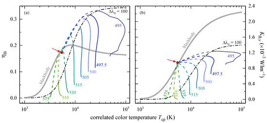 (a) BLH efficiency, , and (b) BLH efficacy of luminous radiation, , of color LEDs depending on bandwidth, , and plotted versus correlated color temperature (CCT), , on a logarithmic abscissa. The peak wavelengths, , are given as numbers in nanometer. Solid lines represent a 1 nm 100 nm bandwidth variation. Further increasing up to 1000 nm (dashed lines) leads to (a) 0.17 and (b) 9.5 × 10−4 Wlm−1 convergence points (full circles highlighted by arrows) at 5463 K with 0.33. The dash-dotted lines parametrize and for 100 nm according to the five-parameter logistic function in Equation (10). The blackbody radiator’s and are included as double solid lines. Note the steps in both 495 nm curves at 50,000 K that appear because of the parameter change in Equation (A6) (see Appendix A).