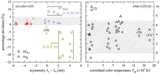 Percentage deviations, and , for BLH efficiencies and BLH efficacies of luminous radiation, respectively, that were calculated according to Equations (8) and (9) (color LEDs) as well as Equations (5) and (6) (pc-LEDs). The percentage deviations were determined with regard to the measured values of those LEDs listed in Table 2. (a) and as a function of asymmetry. The symbols are colored with respect to the LED’s chromaticity. (b) Semi-logarithmic presentation of and for pc-LEDs as a function of . Numbers in brackets refer to the running index . In both panels, horizontally dashed lines represent zero percentage deviation, and the hatched areas visualize (a) 0–5% and (b) 0–7% deviation.