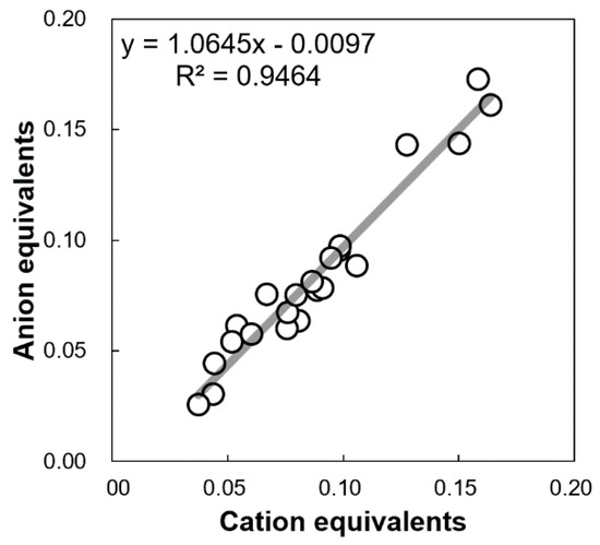 Among the eight WSIIs, SO42− had the highest average concentration (3.78 ± 1.77 μg/m3), followed by NH4+ (1.35 ± 0.59 μg/m3). Moreover, the concentration of NO3− (0.28 ± 0.23 μg/m3) was also higher than those of the other WSIIs (Table 1). These three species constituted at least 85% of the daily ƩWSIIs and are therefore the main WSII species of PM2.5, which is consistent with previous studies [24,41,50]. Because anions can increase the acidity of PM and cations can increase the alkalinity of PM, the AE/CE ratio is a good indicator for determining the acidity or alkalinity of PM [23]. As shown in Figure 2, AE/CE was 1.06, with good linearity (r = 0.97), indicating that PM2.5 was relatively neutral at Kirishima during the sampling period. Moreover, the AE/CE value, which was close to 1, also corroborates the validity of the WSII measurements, indicating that most WSII species were quantified [51].