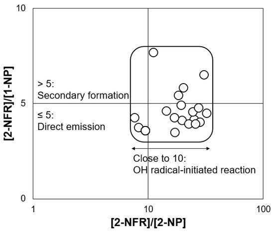 Table 2 summarizes some of the diagnostic ratios of PAHs, NPAHs, and WSIIs at Kirishima during the sampling period. The [FR]/([FR] + [Pyr]) ratios ranged from 0.50 to 0.74, with an average of 0.61, and the [BaA]/([BaA] + [Chr]) ratios ranged from 0.34 to 0.52, with an average of 0.41. Compared to the reference value of PAH diagnostic ratios emitted from coal burning and traffic emissions [52,53], the potential source of the emissions in this study was coal burning. Moreover, the [1-NP]/[Pyr] ratios, which ranged from 0.005 to 0.019 and had an average of 0.008, was also close to that of coal burning emissions [21]. However, the [BbF]/([BbF] + [BkF]) ratios ranged from 0.72 to 0.76, the [BaP]/[BgPe] ratio ranged from 0.32 to 0.90, and the [IDP]/([IDP] + [BgPe]) ratios ranged from 0.34 to 0.58; these values are between those for coal burning and traffic emissions, indicating mixed sources for the PAHs in this study [37,53,54]. Of the three NPAHs, 1-NP is primarily formed, and 2-NFR and 2-NP are secondarily formed [48]. As shown in Figure 3, the [2-NFR]/[1-NP] ratios ranged from 3.50 to 7.68, with an average of 4.51, and its values were mostly lower than 5. These values indicate the higher contribution of direct emissions such as coal burning during the sampling period [55]. The [NO3−]/[SO42−] ratio is usually used to estimate the relative importance of traffic emissions and coal burning sources [42]. Table 2 shows that these ratios ranged from 0 (NO3− concentration was less than the LOD) to 0.32, with an average of 0.11. Ratios lower than 1.0 indicate that the emission sources were more likely related to coal burning [42]. Consequently, the diagnostic ratios of PAHs, NPAHs, and WSIIs indicated that the main sources at Kirishima during the sampling period were mixed but that coal burning made a higher contribution than traffic emissions.