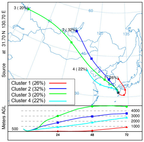 Cluster analysis of 72-h tracking backward trajectories at Kirishima during the sampling period.