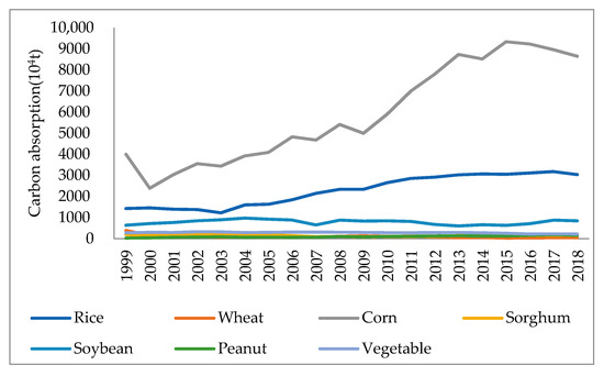 In terms of inter-annual changes, the total carbon absorption of the three crops, including corn, rice and soybean, has a larger proportion, suggesting that the carbon absorption of the plantation industry in the three northeastern provinces mainly relies on these three crops. In particular, the trend of carbon absorption of corn can be roughly categorized into three stages. The first stage is a significant decrease in 1999–2000; the second stage is a fluctuating increase in 2000–2015; followed by a decreasing trend in the third stage between 2016 and 2018. Subsequently, the more significant increase has been in carbon absorption by rice. Carbon absorption by soybean remains more stable and almost unchanged. Since the absolute values of carbon absorption for vegetables, wheat, sorghum and peanuts are relatively small, no significant changes can be seen in the above figure. As compared to corn and grain, the carbon absorption of other crops basically maintains a more stable state.