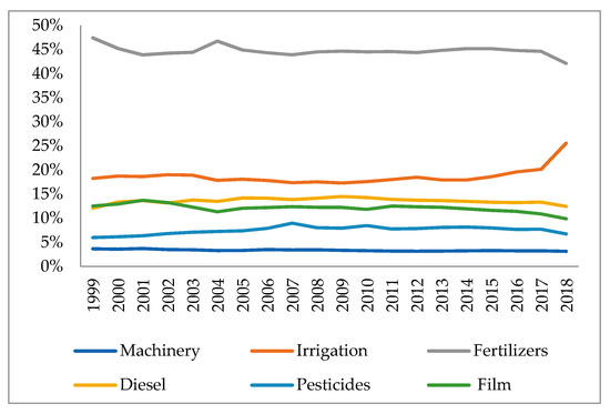 Proportion of carbon emissions from agricultural element inputs in plantation. Data Source: calculated by the authors.