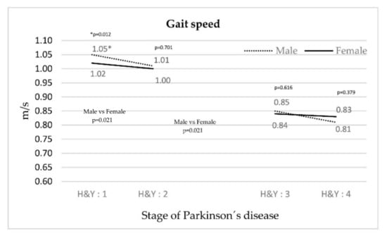 Figure 1 illustrates a decrease in walking speed concurrent with an increase in the stage of PD for both genders. The decrease is less significant in stage III–IV patients and in women compared with their respective counterparts.