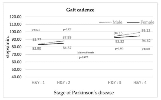 In Figure 2, the cadence for both genders increases as the PD stage rises. The smallest increase was in women.