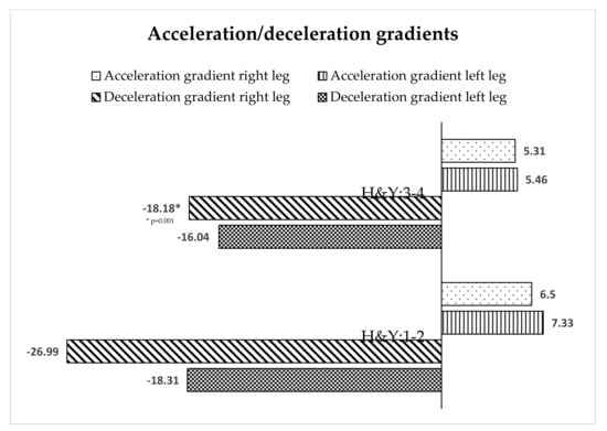The behavior of the acceleration and deceleration gradient of the left leg in both stages was similar (Figure 3), but in the right leg there were significant differences in the deceleration gradient in stages H&Y I–II.