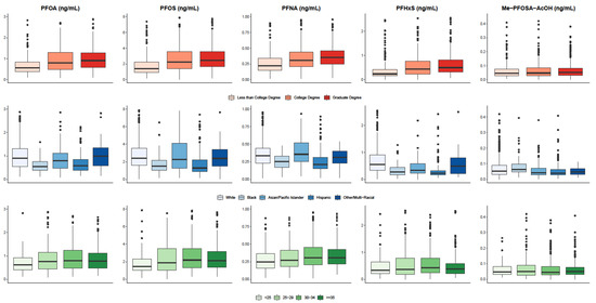 Distribution of PFAS (ng/mL) levels with >95% detection across selected demographic characteristics.