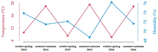 Seasonal means of temperatures and relative humidity recorded in Verona (Villafranca monitoring station, VILSPA; www.ilmeteo.it/portale/archivio-meteo/Verona) through the study period. Winter-spring: 1 December to 31 May; summer-autumn: 1 June to 30 November.