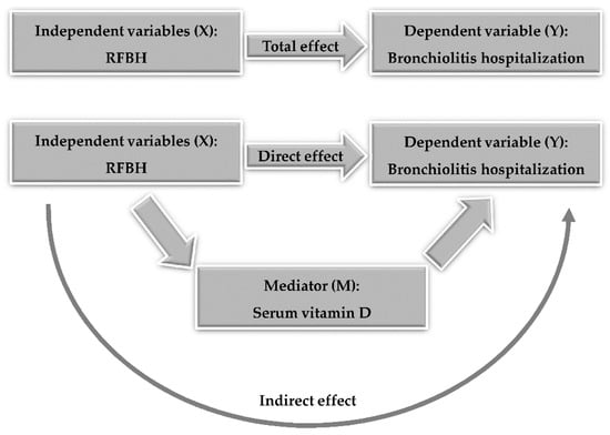 The extent to which the relationship between the RFBH and bronchiolitis hospitalization could be ascribed to a direct or vitamin D-mediated (indirect) effect was investigated through a MA. In MA, some X-Y (RFBH-bronchiolitis hospitalization) association, that is, the “total effect”, is initially assessed; then, a mediator M (vitamin D) is introduced, and the X-Y association may decrease, increase, or remain the same; this is referred to as the “direct effect”. The difference between the total and the direct effect is therefore the “indirect effect” of X on Y via M (Figure 2).