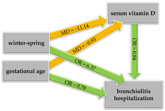 Mediation analysis showed that the winter-spring season was associated with low serum vitamin D levels, which were in turn associated with an increased risk of bronchiolitis hospitalization in children aged <2 years; despite that, the path of association between the winter-spring season and bronchiolitis hospitalization was found to be predominantly direct rather than vitamin D-mediated. A lower gestational age was also found to be directly associated with bronchiolitis hospitalization.