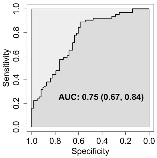 Increasing serum vitamin D levels were significantly associated with a lower risk of bronchiolitis hospitalization (OR = 0.84, 95% CI: [0.72, 0.98] for a 10-nmol/L increase, p = 0.035). Being hospitalized in winter-spring was significantly associated with a lower serum vitamin D level (MD = −11.14 nmol/L, 95% CI: [−21.05, −1.23], p = 0.029) and a higher risk of bronchiolitis hospitalization, for which the effect was predominantly direct (OR = 6.37, 95% CI: [2.58, 15.71], p < 0.001); indeed, only 9% of the total effect was mediated by the serum vitamin D level. An increased gestational age was significantly and directly associated with a lower risk of bronchiolitis hospitalization (OR = 0.78, 95% CI: [0.65, 0.94] for a one-week increase, p = 0.008), and the direct effect was slightly larger than the total effect (OR = 0.79, 95% CI: [0.66, 0.95], p = 0.012); indeed, the direction of the indirect effect was opposite (OR = 1.02, 95% CI: [0.98, 1.05], p = 0.334). This can be referred to as a case of “inconsistent mediation” or “suppression effect” and the percent mediated effect is meaningless in this context [15]. Indeed, increasing gestational age was tendentially associated with a lower vitamin D level (MD = −0.93 nmol/L, 95% CI: [−2.63, 0.77], p = 0.285), which was in turn associated with a higher risk of bronchiolitis hospitalization. The AUC associated with the logistic regression model for bronchiolitis hospitalization was 0.75 (95% CI: 0.67–0.84); the ROC curve is depicted in Figure 4.